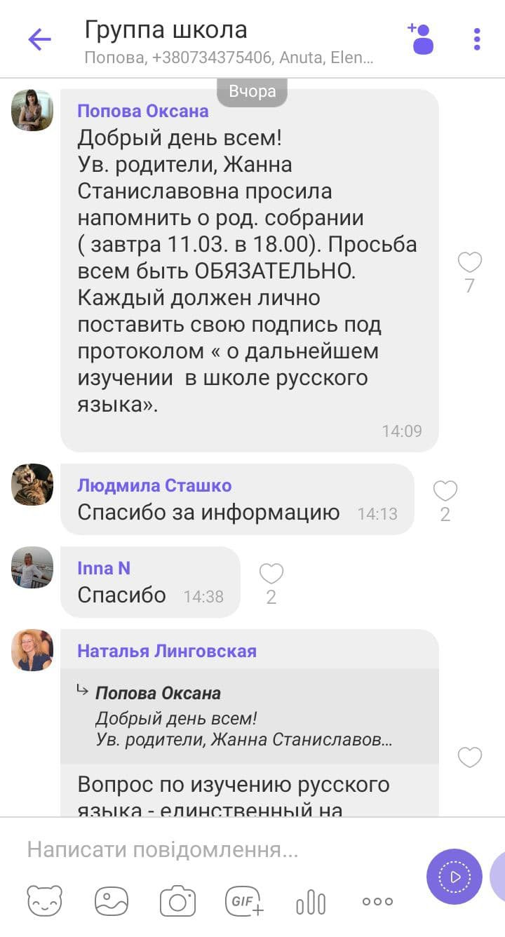 У батьківському чаті вчителі змушують батьків проголосувати за те, щоб залишити вивчення російської мови.