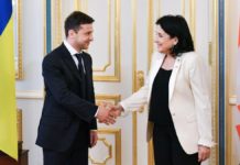 Президент України Володимир Зеленський 23 червня зустрів президентку Грузії Саломе Зурабішвілі на ґанку Маріїнського палацу в Києві, трансляцію церемонії проводили на сторінці Офісу президента у Facebook.