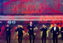 Учасники кварталу танцювали на сцені на фоні розмальованої...