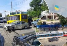 У Києві сталась масштабна ДТП за участі близько 10 автівок. Причиною аварії став трамвай, який зʼїхав згори та "протаранив" машин, а тоді врізався в інший громадський транспорт.