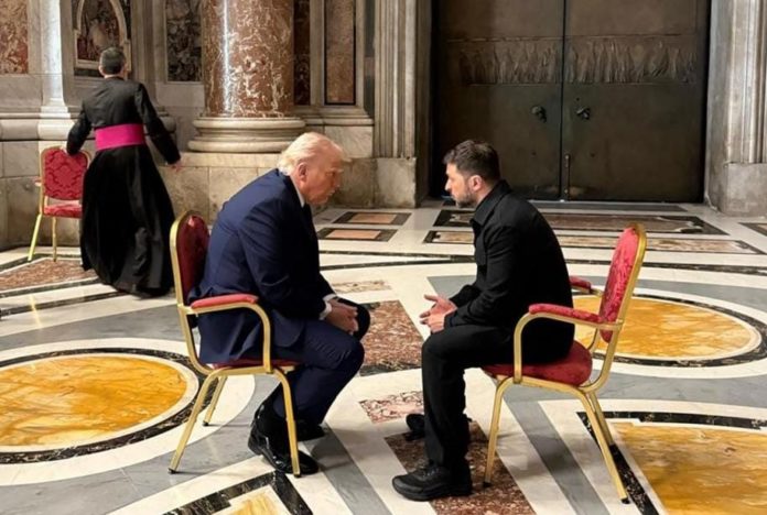 According to AP News, U.S. President Donald Trump and Ukrainian President Volodymyr Zelenskyy held a brief but significant 15-minute meeting at St. Peter’s Basilica in Vatican City before the funeral of Pope Francis. The discussion focused on the necessity of a full and unconditional ceasefire. Trump described the conversation as “very productive,” and Zelenskyy called it “potentially historic.”