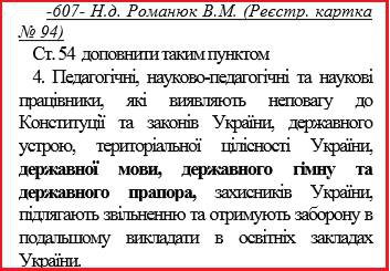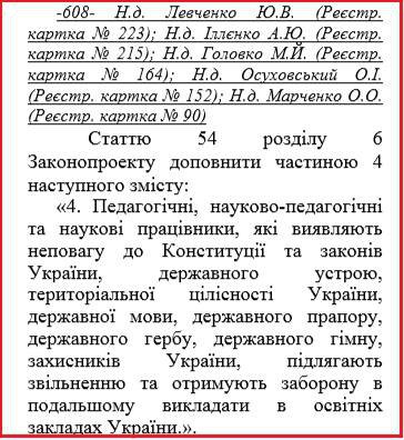 Закон про освіту пропонує доповнити таким пунктом: “Педагогічні, науково-педагогічні та наукові працівники, які виявляють неповагу до Конституції та законів України, державного устрою, територіальної цілісності України, державної мови, державного гімну та державного прапора, захисників України, підлягають звільненню. Їм заборонено в подальшому викладати в освітніх закладах України”.