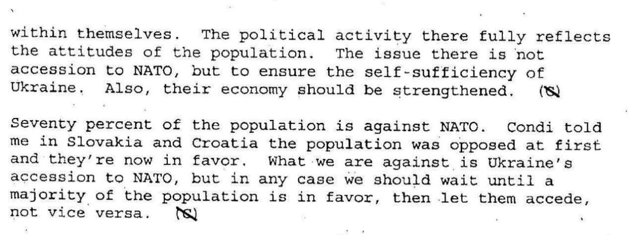 Вже тоді він виступив проти можливого вступу України до НАТО. Про це повідомляє 24 Канал з посиланням на пресцентр Національного архіву безпеки США.