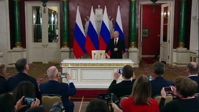 Заяву довго чекали журналісти, адже Путін прийшов мало не на 2 години пізніше заявленого часу. А коли прийшов, то більшість часу присвятив звинуваченням у бік України.