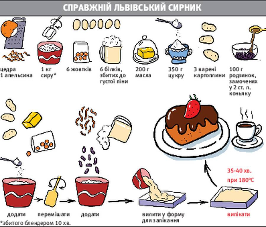 — Найголовніше — свіжі та правильно відібрані інгредієнти, — розповідає львів’янка Людмила Безверха. — Купую на ринку чи у фермерських магазинах. Яйця мають бути з жовто-гарячими жовтками. Сир — жирний, м’який. Якщо сухий і розсипається — така вийде й страва. Масло беру 82 відсотки жирності. Якщо додати манку, борошно чи сметану — це запіканка, а не сирник.