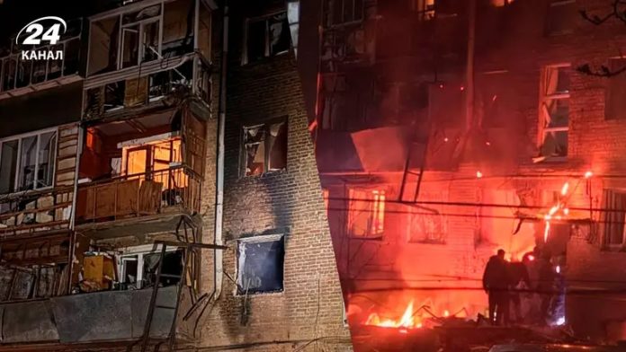 У ДСНС уточнили, що перший удар окупанти завдали по багатоквартирному житловому будинку. Як наслідок – руйновано перекриття покрівлі, також виникло загоряння.