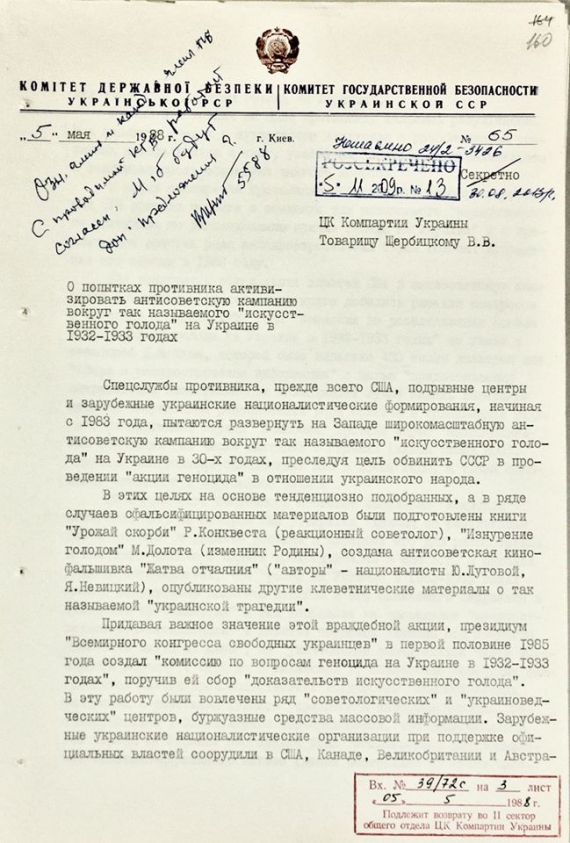 Служба безпеки України оприлюднила архівні документи КДБ про замовчування трагедії Голодомору радянською владою.