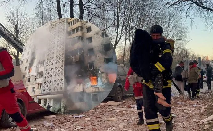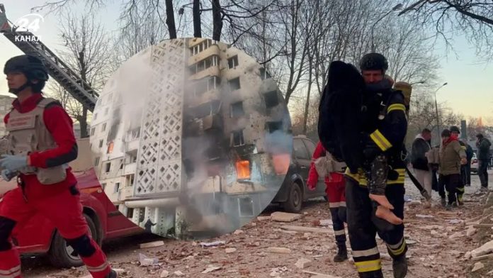 Раніше в Нацполіції розповіли, що пошкоджено 2 житлові дев’ятиповерхівки. В одній виникла пожежа, а в іншій є руйнування з 3-го по 9-й поверх.