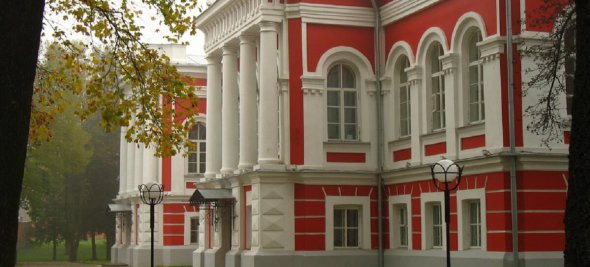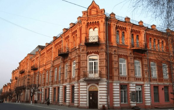 Глухівський національний педагогічний університет вирізняється яскраво-червоним кольором стін і білими колонами.
