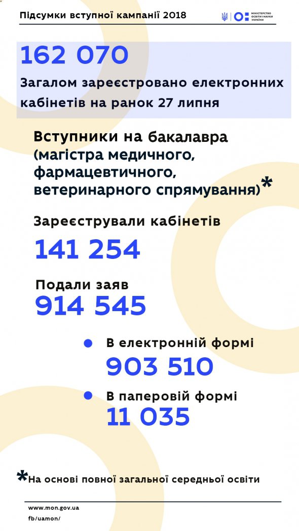 “Вступники подали близько 915 тисяч заяв. З них в електронній формі 903 тисячі, а в паперовій – близько 11 тисяч. Наші прогнози щодо кількості заяв та їх структури, які ми озвучили на початку вступної кампанії, справдилися. Близько 76% школярів, що випустилися цього року, подали заяви на вступ до вишів на бакалавра та магістра”, – каже Шаров.