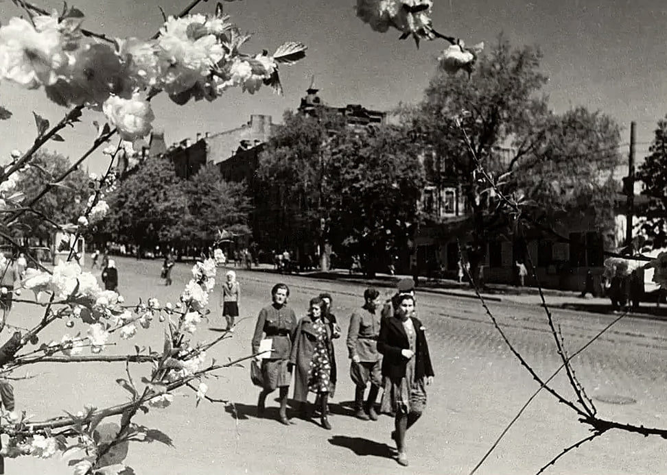 З’явилися фото Києва, зроблені за рік після перемоги над ворогом у Другій світовій війні. Напівзруйнований Хрещатик, воєнні паради і натхненні обличчя молоді – таким малюється столиця на світлинах 1946-го року.