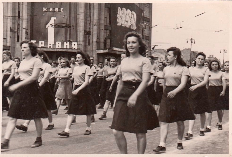1 травня 1946 року. Спортивний парад на Хрещатику. Крокують студентки Київського інституту фізкультури.